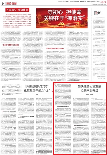 韦颜秋副教授理论文章“加快融租赁发展 拉动产业升级”。文章指出,天津经济正进入结构调整、产业升级、创新孵化、孕育高质量发展的关键时期,融资租赁具有独特资源配置功能,有望在天津新一轮发展契机中发挥引领和带动作用,加速产业升级、培育新兴产业。从企业总部设立数量、注册资金和业务总量三项指标来看,近几年,我市融资租赁稳步发展,一直处于全国领先地位。融资租赁具备得天独厚的优势,是推进经济高质量发展的重要方面,重新审视融资租赁之于产业升级和经济发展的意义和功能,谋划兼具创新性和实践性的对策建议,成为当前亟须思考的重大议题。文章从对融资租赁功能的再认识、充分发挥融资租赁作用的对策两个方面就加快融资租赁发展,拉动天津产业升级做了详细阐释。