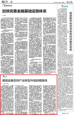韦颜秋副教授理论文章“增强金融支持产业转型升级的精准性”。文章指出,金融是现代经济的核心,作为关键投入要素,金融在产业形成、发展、调整和升级的各个阶段都起着至关重要的作用。当前,我国经济已由高速增长阶段转向高质量发展阶段,正处在转变发展方式、优化经济结构、转换增长动力的攻关期。以产业结构调整为抓手,更好推动产业转型升级,是当前工作的重中之重。在此进程中,切实发挥金融支持实体经济的作用,不断优化资本要素在产业转型升级中的配置较为关键。文章从厘清思路、找准问题、精准施策三个层次就切实发挥出金融在推动产业转型升级中的重要作用做了详细阐释。人民网等媒体转载。
