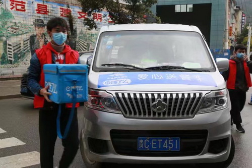 孙浪同学在进行当地灵犀酒店“爱心餐”配送工作
