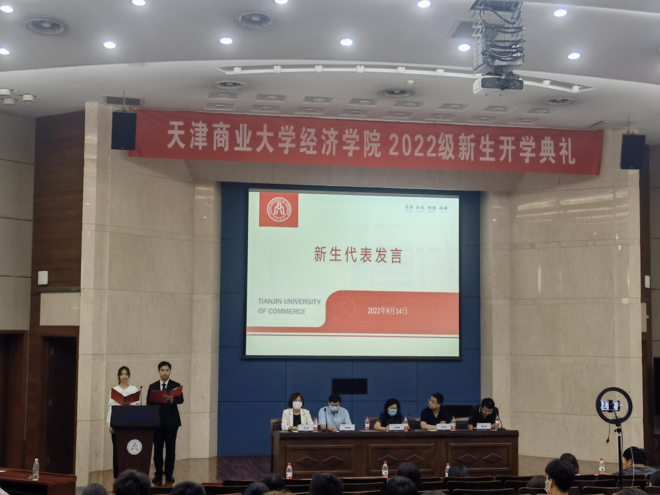 陆洲教授作为优秀教师代表发言,首先,他阐释了和平与发展的时代主旋律,希望同学们积极拥抱新时代。然后,他讲到大学需要实现两大目标:发现自己的比较优势和锻炼出强健的体魄。最后,他强调面对巨大的防疫压力,希望新同学们在行动上积极配合,构建天商共同体。2022级金融专硕研究生王家浩然、经济学类2203班本科生冯雅晨作为新生代表发言,表示会牢记“笃学、弘毅、明德、济世”的校训,与天商共创新的辉煌。在校生代表21级产业经济学研究生吕梁结合自身的学习、工作、实践经历寄语2022级新生要坚守初心,勤学善思,不懈奋斗。