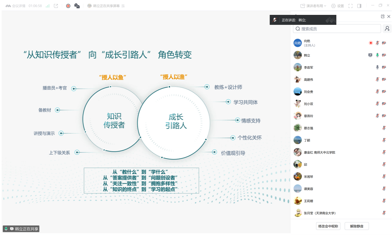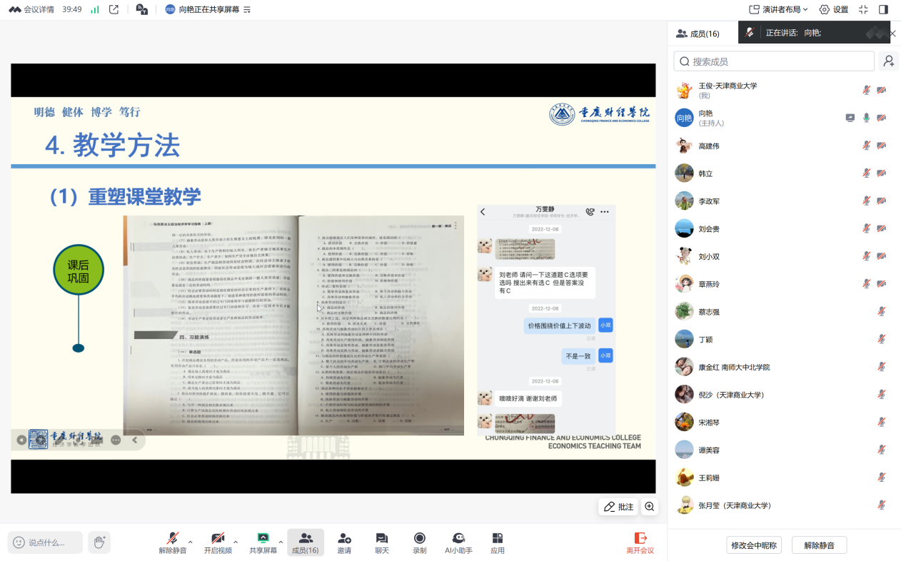 会上,重庆财经学院李政军教授、向艳老师详细分享了该校政治经济学课程组在教学设计、课堂教学方式重塑等方面的宝贵经验。宁夏大学的韩立教授介绍了其教学团队在使用AI技术促进教学改革方面所做的多项工作,分享了他们在智慧课程建设方面的宝贵经验。探花社区